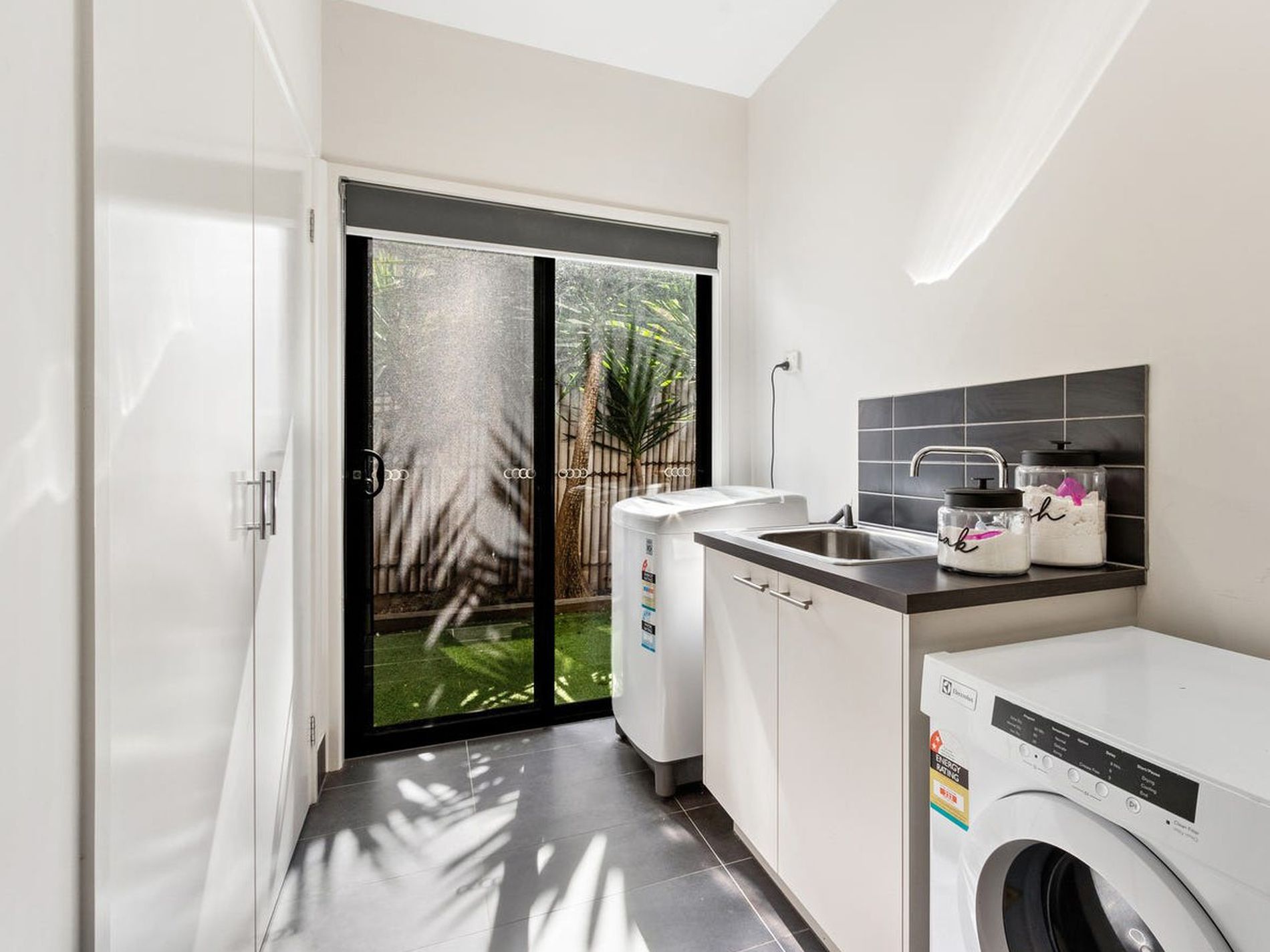 The central bathroom includes a bathtub and separate shower, complemented by a separate powder room for added convenience. The laundry offers built-in cabinetry and comes complete with a washing machine and dryer.