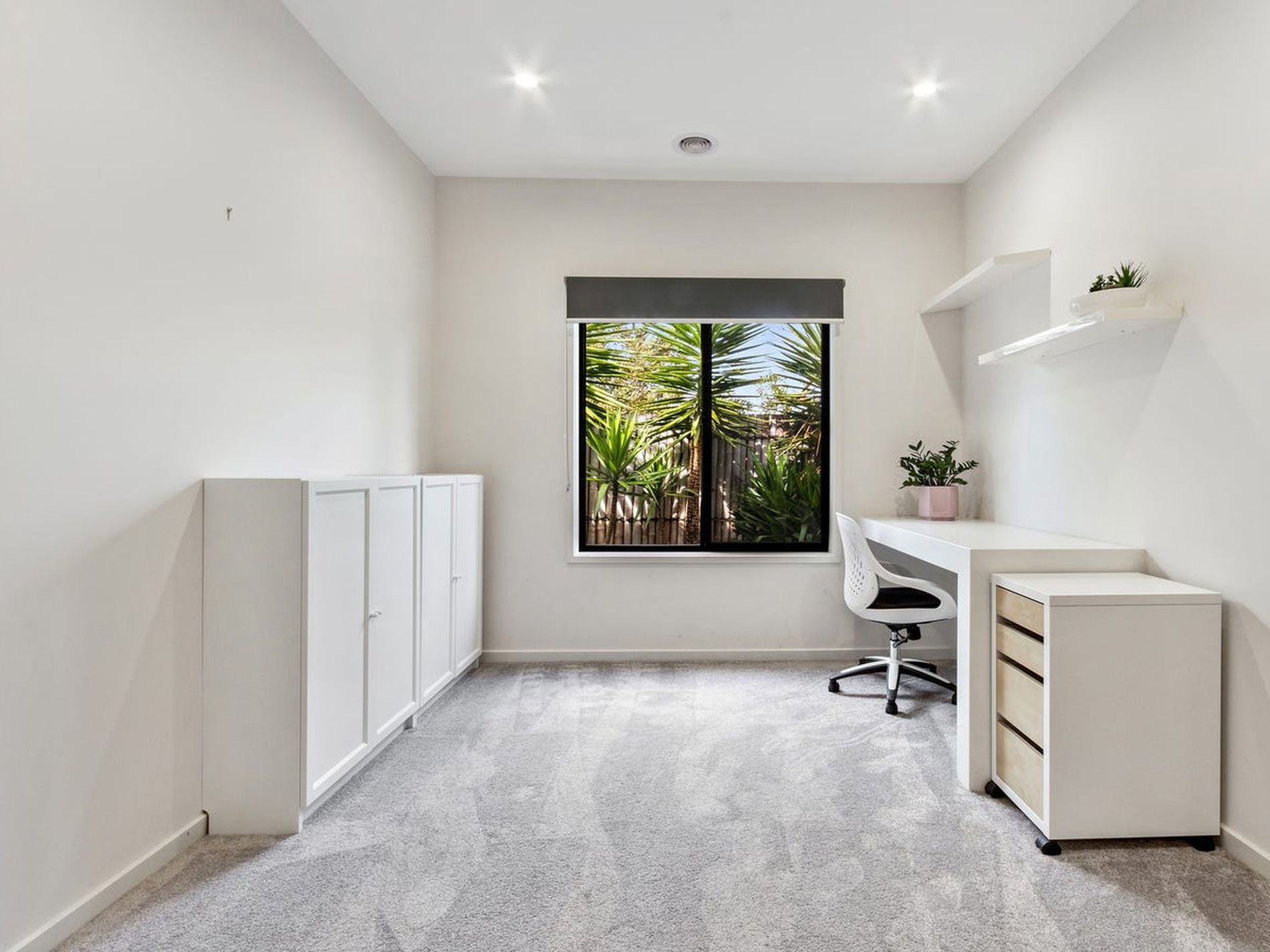 The home offers multiple living zones, including a formal lounge with bookshelf, a spacious open-plan living and meals area, and a dedicated study fitted with a desk and movable drawers, perfect for those working from home. The main living area comes furnished with a leather lounge suite, coffee table, side table, TV unit and dressing table with stool, while the meals space includes a six-seater dining table, chairs and buffet.